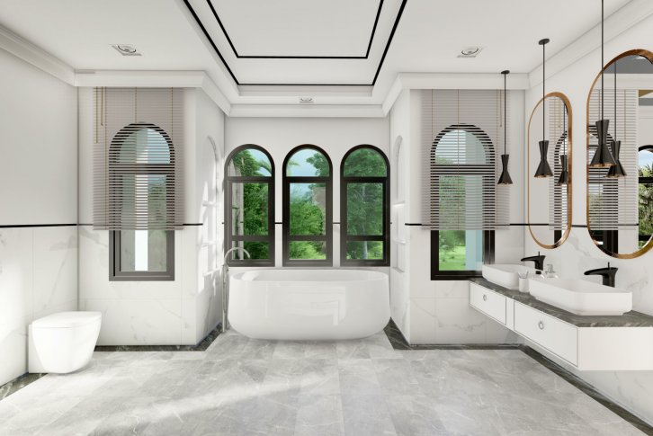 Ванные комнаты с душевой кабиной (ванна в главных и основных ванных комнатах), туалетом, раковиной и прочей сантехникой.